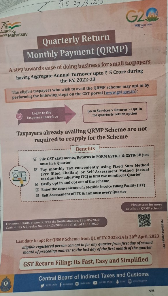 GST quarterly return monthly payment scheme–Courtesy Government ad–Business Standard 27.4.23