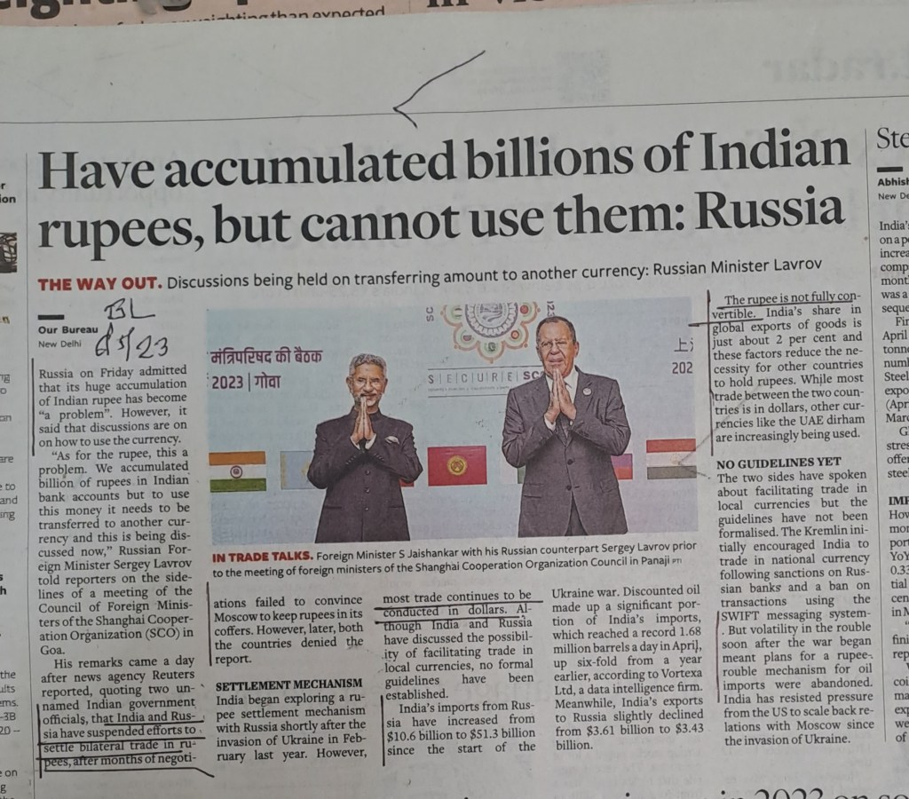 Why Russia and India have suspended talks to settle trade dues in rupees ? —Trade with Russia –cannot be settled in dollars for obvious reasons [1] in dollar terms– Exports to Russia 3/4 billion dollars and imports–at its peak level —are 51 billion dollars – per month -[2] and because of adverse trade gap –balances in rupee terns r bulging which Russia cannot put to use –Courtesy BusinessLine 6.5.23