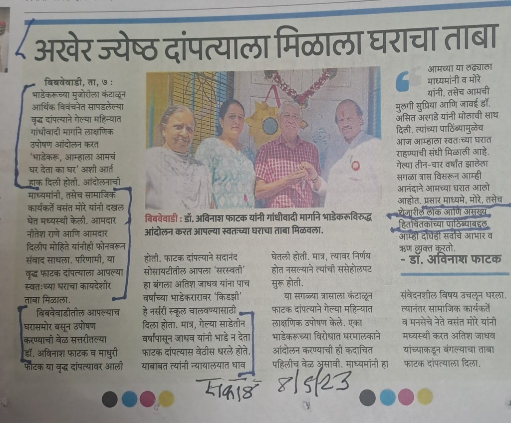 डॉक्टर अविनाश फाटक यांचा असाही गांधीवादी मार्गाने लढा! कायदेशीर मार्गाने लढाई चालू होतीच पण ? ? ? सौजन्य सकाळ 8.5.23