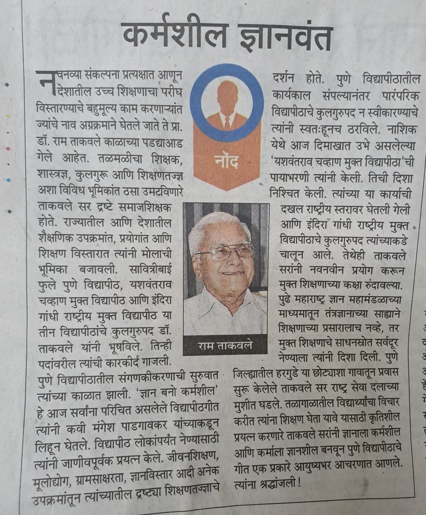 नव्यनव्या संकल्पना प्रत्यक्षात आणून देशातील उच्च शिक्षणाचा परीघ विस्तारण्याचे बहुमूल्य काम करणार्यात ज्यांचे नाव अग्रक्रमाने घेतले जाते ते प्राध्यापक डॉक्टर राम ताकवले काळाच्या पडद्याआड गेले आहेत. सौजन्य महाराष्ट्र टाइम्स 15.5.23