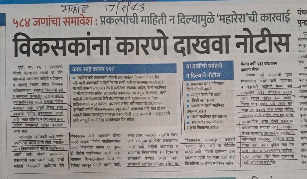 महारेरा कायदा–अमलबजावणी सुरू झाली आहे पण किती परिणामकारक? सौजन्य सकाळ 17.5.23
