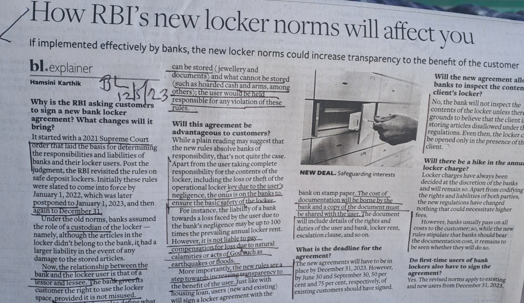 Locker –Obligations of bank and Locker holder — Courtesy BusinessLine 12.5.23
