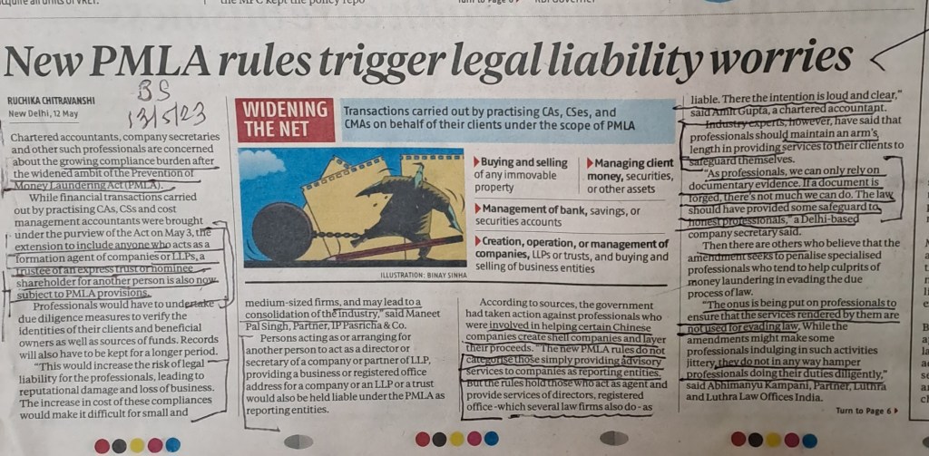 ЁЯЩПTransactions carried out by practising CAs, CSes and CMAs —on behalf of their clients –now under the scope of PMLA –various reactions– Courtesy Business Standard–13.5.23
