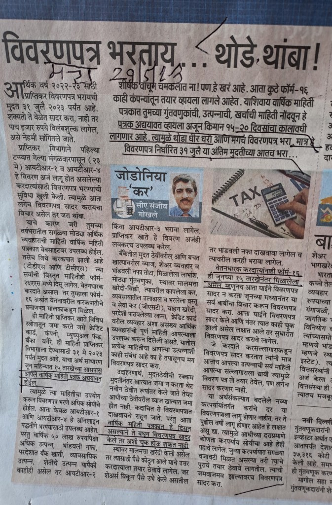 ЁЯЩПрдЖрдпрдХрд░ рдкрддреНрд░рдХ–ITR 1 ITR 4 –рд▓реЗрдЦрдХ CA рдЖрд╣реЗрдд. 15 рдЬреВрди рдкрд░реНрдпрдВрдд рдерд╛рдВрдмрдгреНрдпрд╛рдЪреА рд╕реБрдЪрдирд╛ рдХреЗрд▓реА рдЖрд╣реЗ–рддреНрдпрд╛рдЪреА рдХрд╛рд░рдгреЗрд╣реА рджрд┐рд▓реА рдЖрд╣реЗрдд. рд╕реМрдЬрдиреНрдп рдорд╣рд╛рд░рд╛рд╖реНрдЯреНрд░ рдЯрд╛рдЗрдореНрд╕ 29.5.23