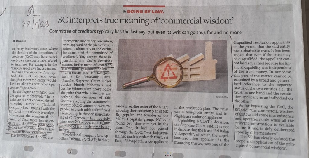 IBC 2016– What is commercial wisdom? Explained Supreme Court –Courtesy BusinessLine 22.5.23