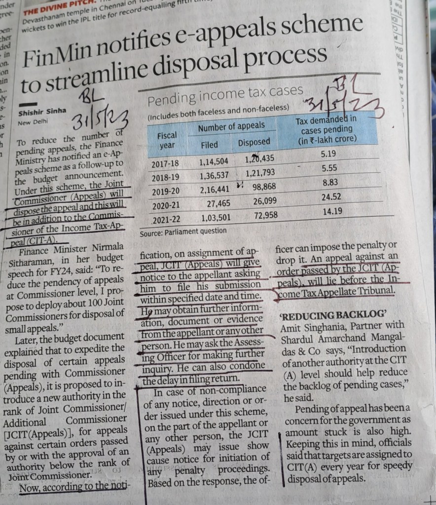 ЁЯЩПBudget promise fulfilled [2] 100 Joint Commissioners r proposed to be appointed for disposal of small appeals [3] appeal against the order –of Joint Commissioner — will lie before IT Appellate Tribunal [4] Tax demanded in cases pending — 14.19 lac crores. Courtesy BusinessLine 31.5.23