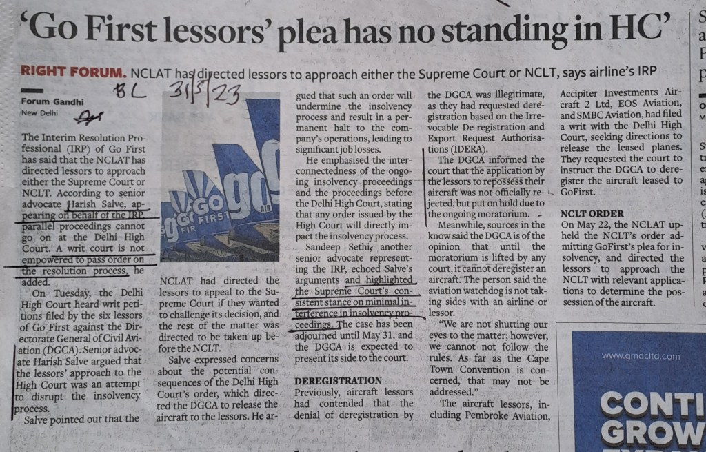 ЁЯЩПFight between rights of lessee [ to get resolution through IBC 2016- Section 10 provision ] and rights of lessor to get back their aircrafts [2] Appeal to Supreme Court likely. Courtesy BusinessLine 31.5.23