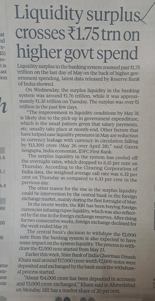 ЁЯЩПPressure on liquidity releases –1.75 lacs crore now –reasons [1] Pick up in Government expenditure [2] 13000 crore on account of 2000 notes deposited–[3] intervention in forex market –Courtesy Business Standard 2.6.23