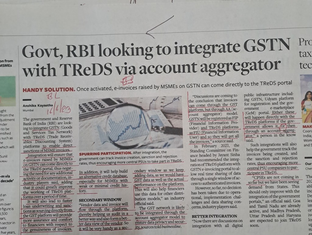 Account Aggregator vis a vis GSTN framework may be useful to effortlessly push credit to MSMEs. — Courtesy BusinessLine 17.6.23