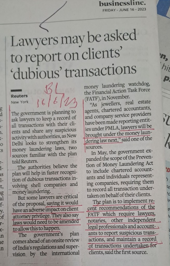 Lawyers also being roped in –Similar on the lines of CA etc– PMLA ambit –Courtesy BusinessLine 17.6.23