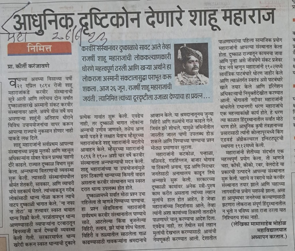 शाहू महाराज यांच्या दूरदृष्टीचा आविष्कार–वाचनीय लेख — सौजन्य महाराष्ट्र टाइम्स– 26.6.23
