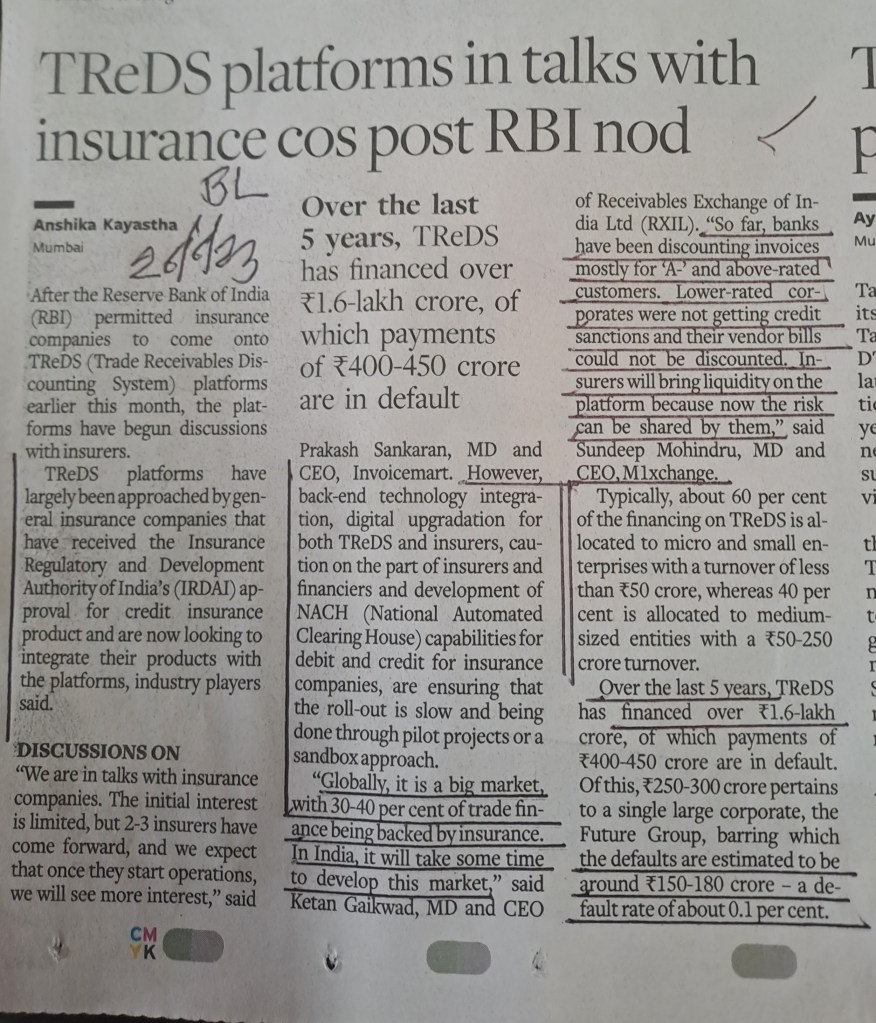 TReDS — Will insurance players make any difference and in what time span ? [2] default rate is a meagre 0.1% –Courtesy BusinessLine 26.6.23