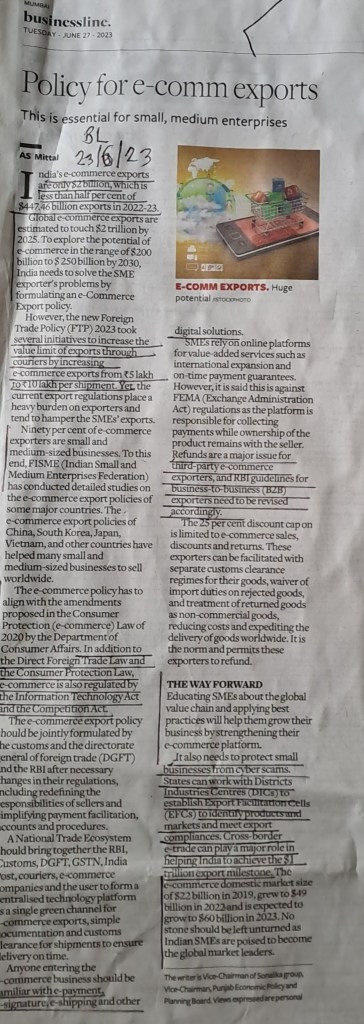ЁЯЩПЁЯЩПЁЯЩПЁЯЩПЁЯЩПImmense potential to increase exports via e-commerce–small & medium enterprises may benefit-Courtesy BusinessLine 23.6.23