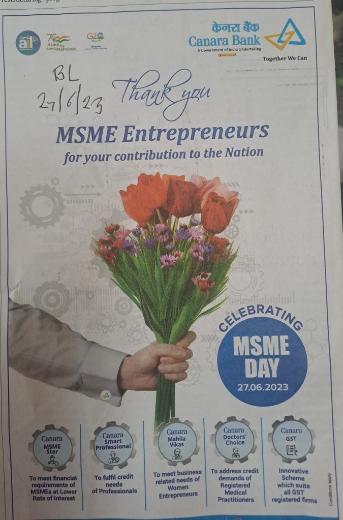 Ad by Canara Bank — MSME finance — Courtesy BusinessLine 27.6.23
