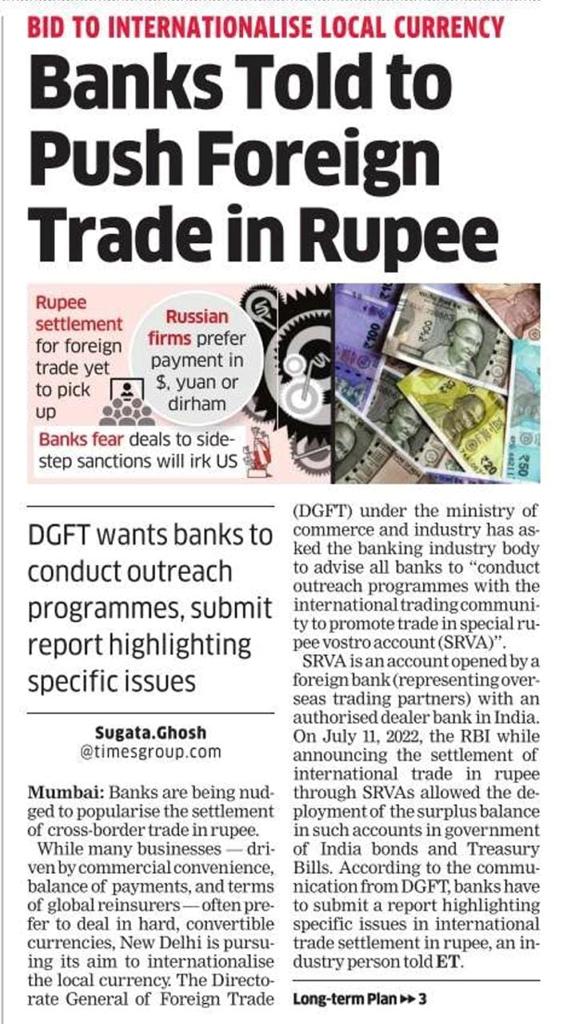 Rupee in foreign Trade–a step that may facilitate international trade if the other party is short on dollars — Courtesy Times of India–27.6.23
