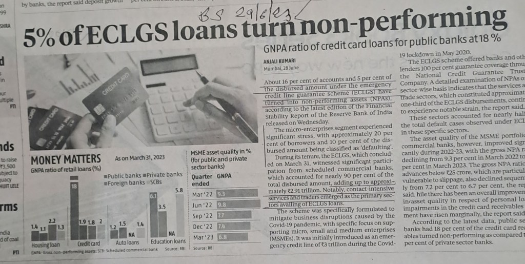 ЁЯЩПCovid period nursing loans –only 5% turned non performing– Courtesy Business Standard 29.6.23