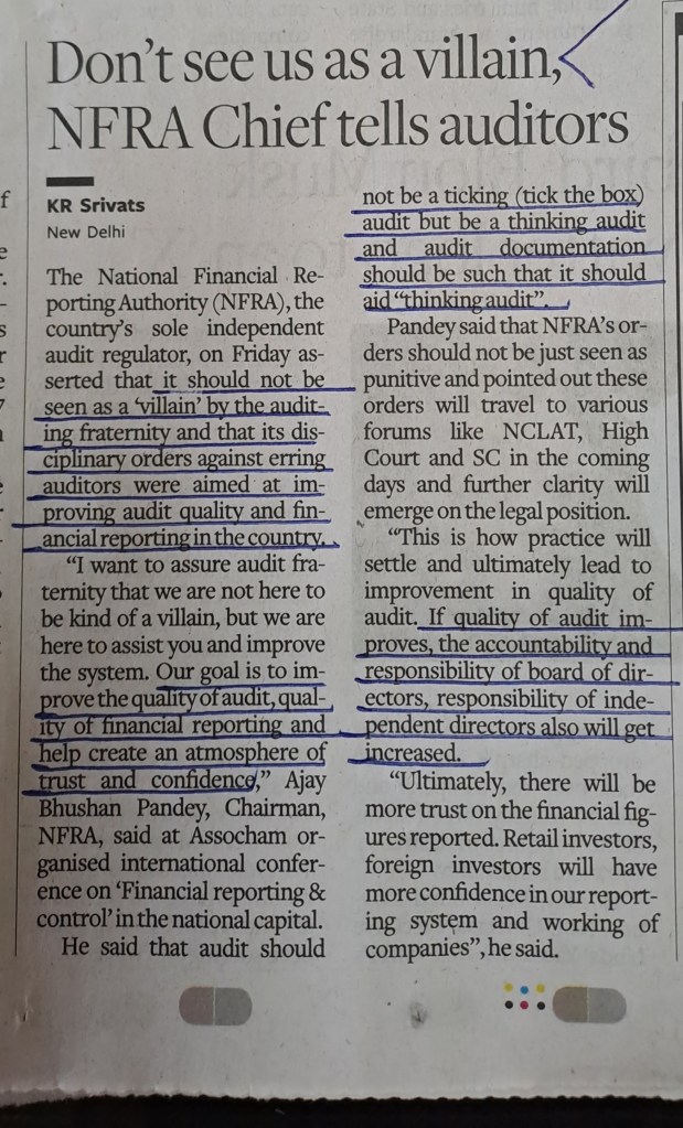 NFRA Chief urges auditing fraternity that audit should be ” thinking audit ” and not ticking g audit –Courtesy BusinessLine 27.7.23