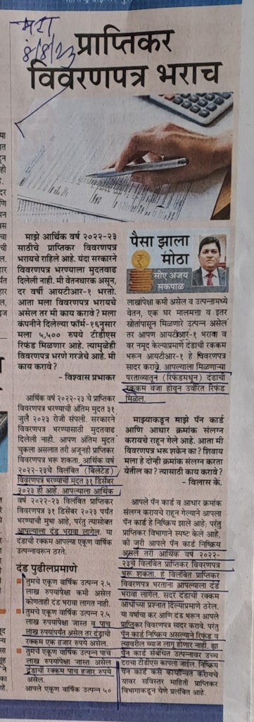 आयकर विवरण पत्रक–किती महत्त्वाचे! सौजन्य महाराष्ट्र टाइम्स 9.8.23