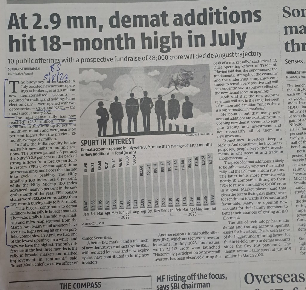 Demat accounts—on further high ! Courtesy Business Standard 9.8.23