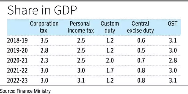 “GST has become the largest contributor to indirect taxes, ever since its implementation in FY 2017-18, “ a Finance Ministry report prepared to meet the obligations of the Government under the Fiscal Responsibility and Budget Management Act, 2003, said. It showed that the share of GST in GDP went up to 3.1 per cent in FY23 from 2.8 per cent in FY21, During the same period share of personal income tax rose from 2.5 to 3.1 per cent of GDP Apart from GST, indirect taxes also include Custom Duty and Central Excise Duty (levied mainly on petrol and diesel). At the same time, direct taxes comprise corporate income tax (CIT) and personal income tax (PIT).