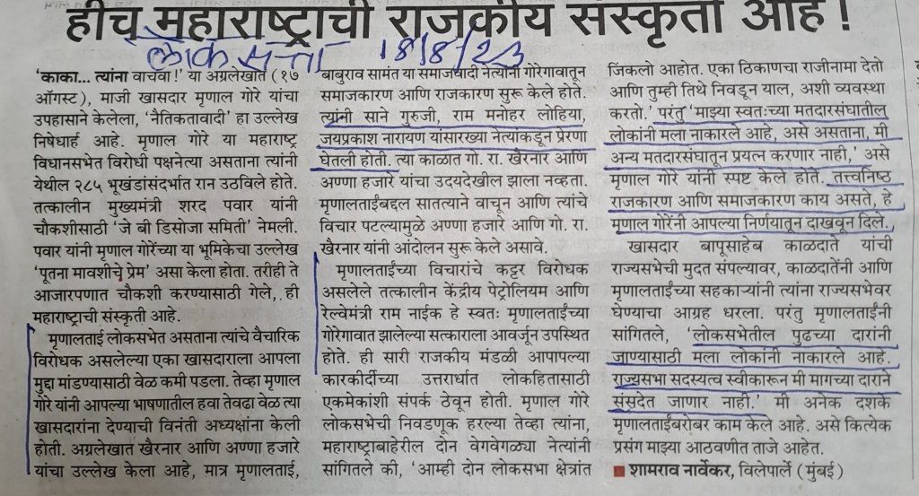 या लेखात मृणाल ताई गोरे व श्री राम नाईक [ माजी रेल्वेमंत्री] यांच्या बाबत च्या काही आठवणी सांगितल्या आहेत त्या वाचण्यासारख्या –सौजन्य लोकसत्ता 18.8.23