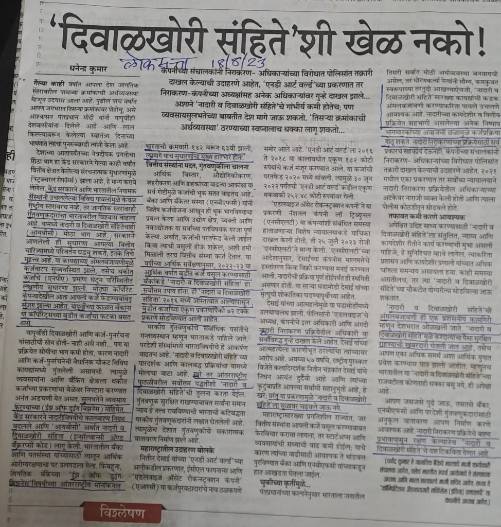हा लेख माजी सनदी अधिकारी [ भारत सरकारचे सचिव] श्री धनेनद्र कुमार यांनी लिहिला आहे–IBC 2016 कायदा हा संदर्भ — सौजन्य लोकसत्ता 18.8.23