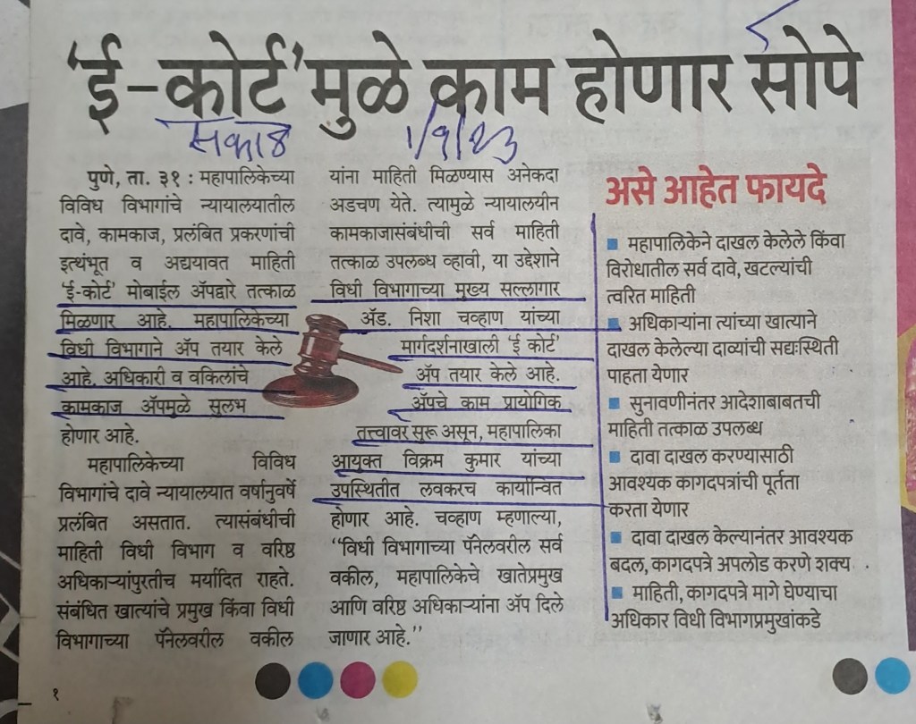ई- कोर्ट– पुणे महानगरपालिका चा स्तुत्य उपक्रम– सौजन्य सकाळ 1.9.23
