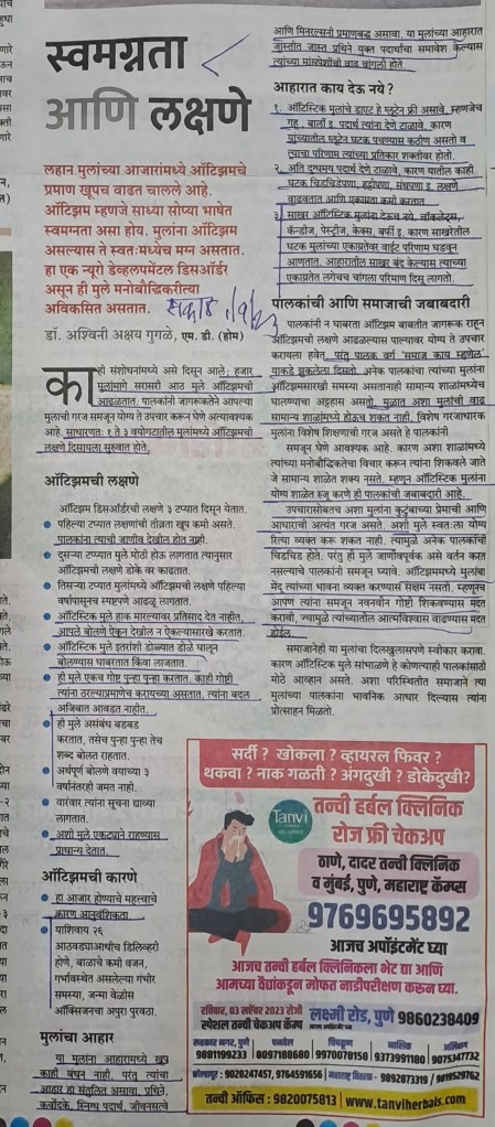 स्वमग्न मुले–प्रमाण 1000 मध्ये 8 — काय काळजी घ्यावी? सौजन्य सकाळ 1.9.23