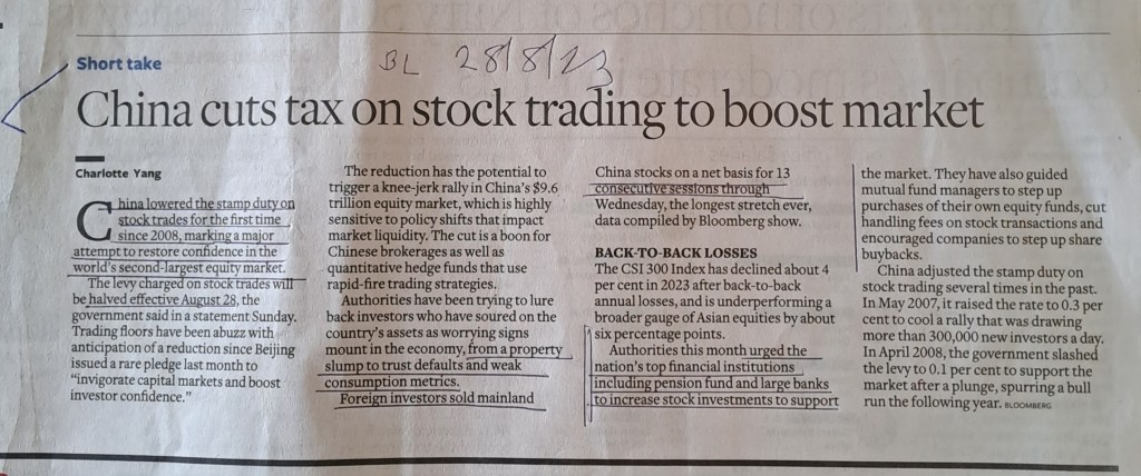 ЁЯЩПChina not only cuts tax on stock trading [ last cut was in 2007 ] but also advises top financial institutions to increase stock investments to support the market –Courtesy BusinessLine 4.9.23