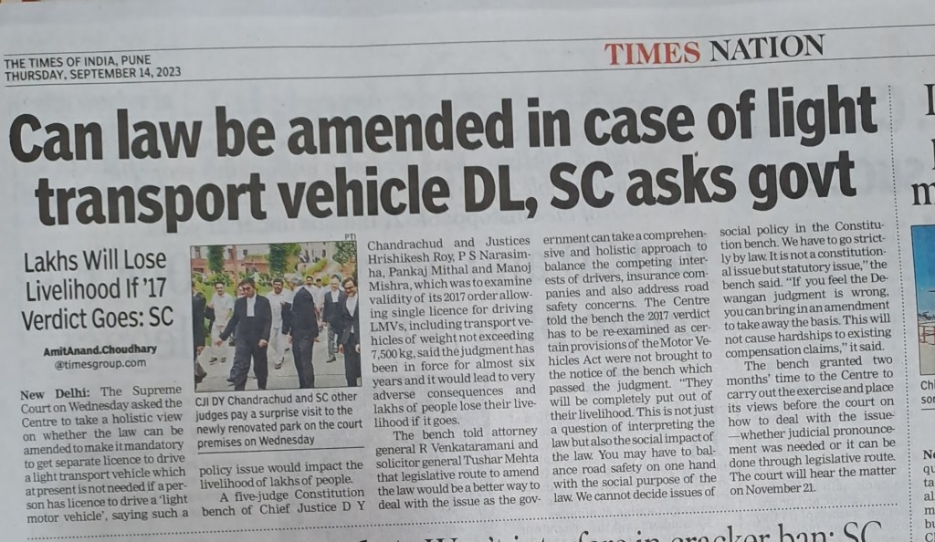 Key issue — light transport vehicle driving licence–Supreme Court raises questions –Courtesy Times of India 14.09.23