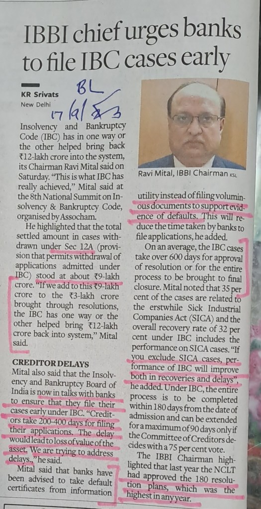 IBBI Chief implores financial creditors to file for insolvency at the earliest opportunity– Courtesy BusinessLine 19.9.23