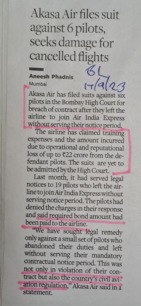 Pilots paid the bond price but airlines takes a stand that serving notice period was necessary– Courtesy BusinessLine 19.9.23