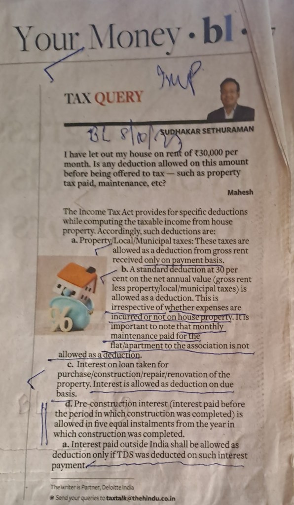 [1] property taxes allowed as deduction only on payment basis [2] 30% standard deduction on net annual value [ gross rent less property taxes ]–and this is allowed regardless of whether such expenses are incurred or not [3] Monthly maintenance is not allowed as deduction [4] Interest on loan is allowed on ” due ” basis [5] Pre-construction interest is allowed in five equal instalments from the year in which construction is completed. [6] interest paid outside India shall be allowed as deduction only if TDS was deducted on such interest payments.