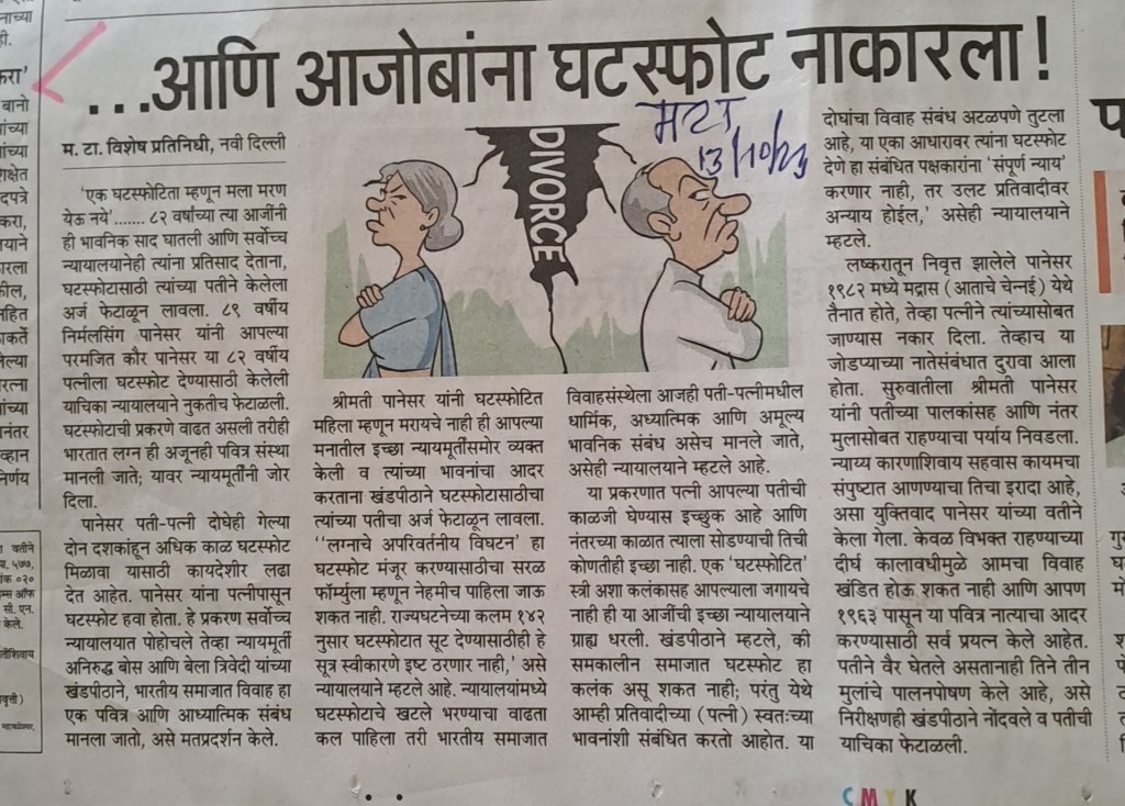 घटस्फोट का नको याचे कारण ऐकून मन सुन्न झाले [2] पण सुप्रीम कोर्टाने जी कारण मीमांसा केली ते वाचून अजूनही विवाह या संस्थेचे पावित्र्य का टिकून आहे ते समजते– सौजन्य महाराष्ट्र टाइम्स 13.10.23