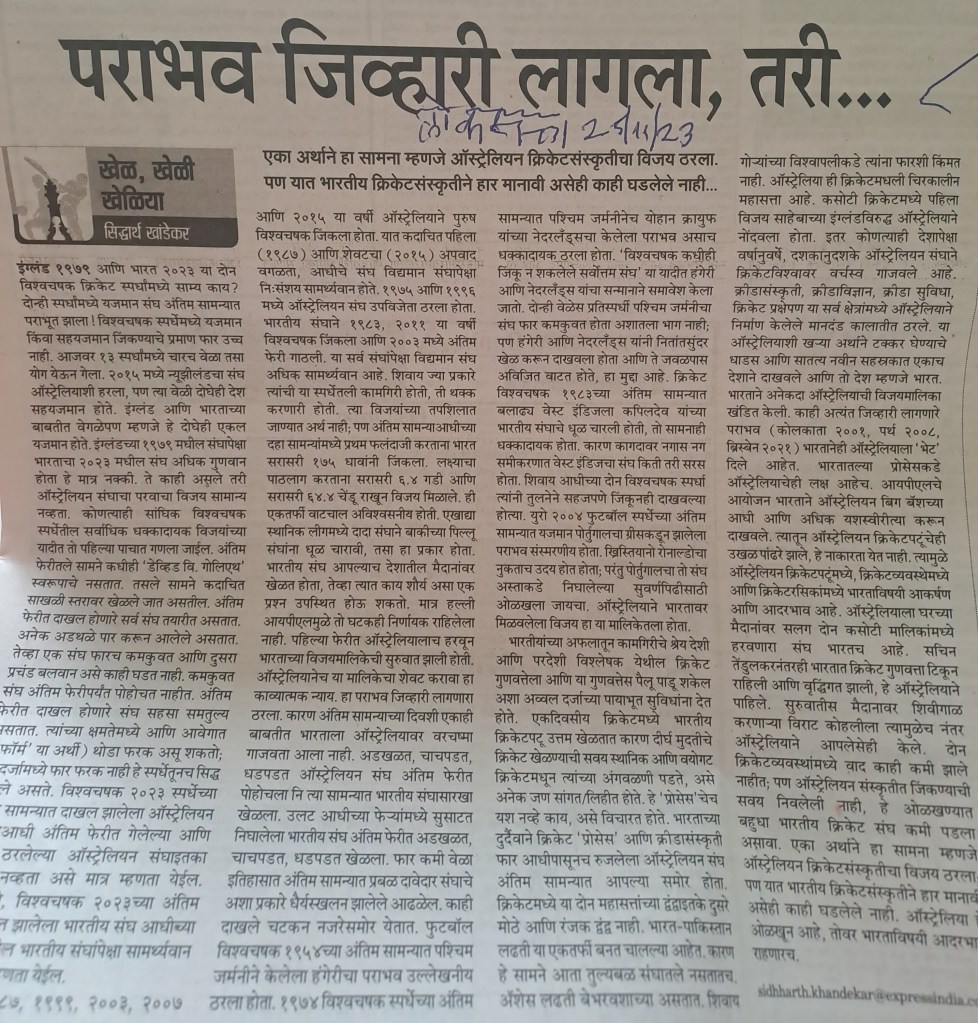 ” एका अर्थाने हा सामना म्हणजे ऑस्ट्रेलियन क्रिकेट संस्कृतीचा विजय ठरला पण यात भारतीय क्रिकेट संस्कृतीने हार मानावी असेही काही घडले नाही “…एका वाक्यात सार –सर्व मजकूर पटणारा! सौजन्य लोकसत्ता 25.11.23