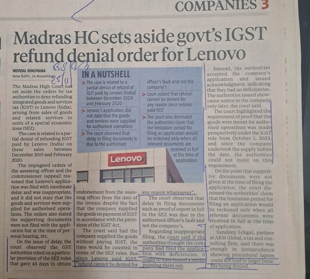 महत्वाचा निकाल मद्रास उच्च न्यायालय — IGST रिफंड आर्डर — सविस्तर बातमी वाचणार गरजेचे — सौजन्य Business Standard