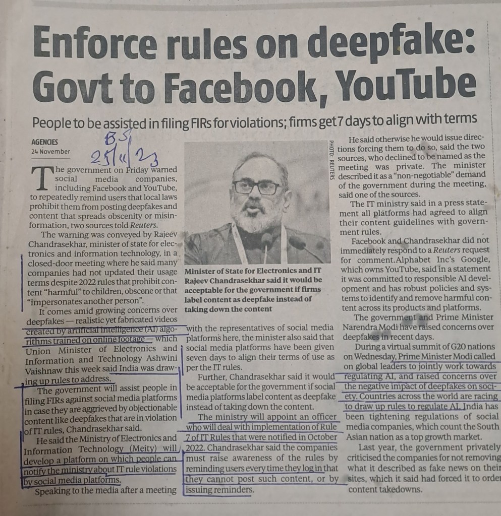 From the news item, I came to know [1] deepfakes r realistic yet fabricated videos created by AI algorithms trained on online footage [2] India is drawing up rules to address–Courtesy Business Standard 25.11.23
