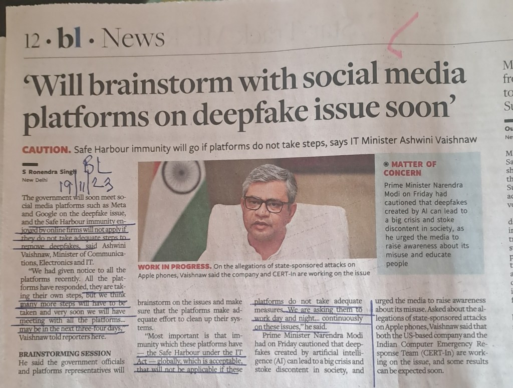 Deep Fake Issue-Government means business–Courtesy BusinessLine 19.11.2023