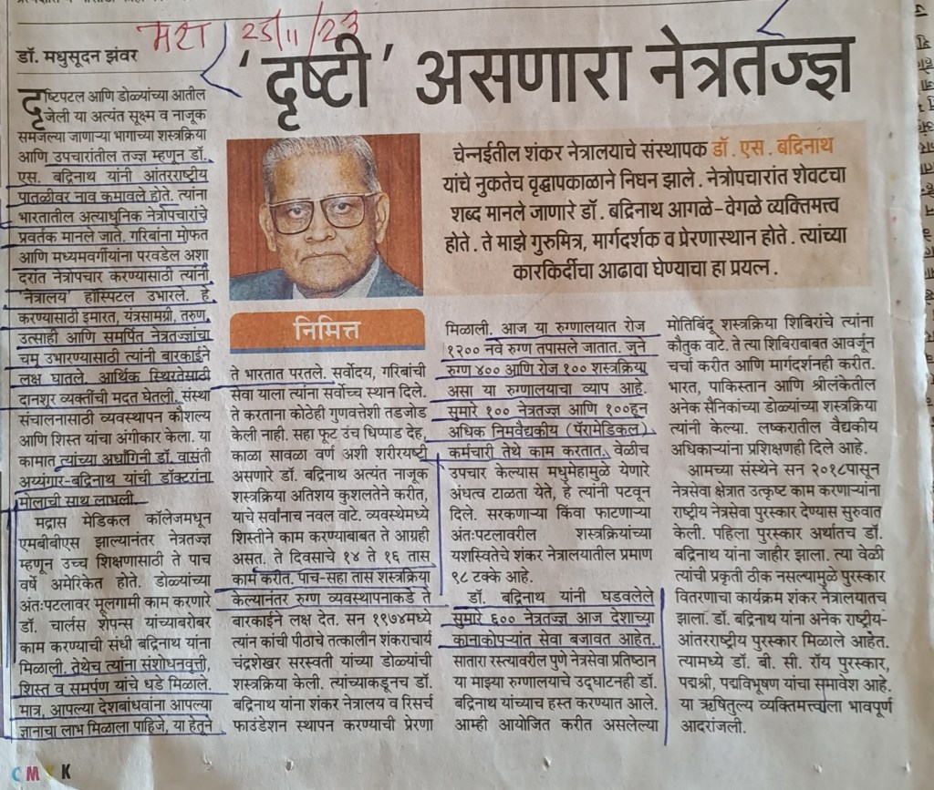 चेन्नईचे डॉ बद्रिनाथ–किती अलौकिक कार्य केले आहे! सौजन्य महाराष्ट्र टाइम्स 25.11.23