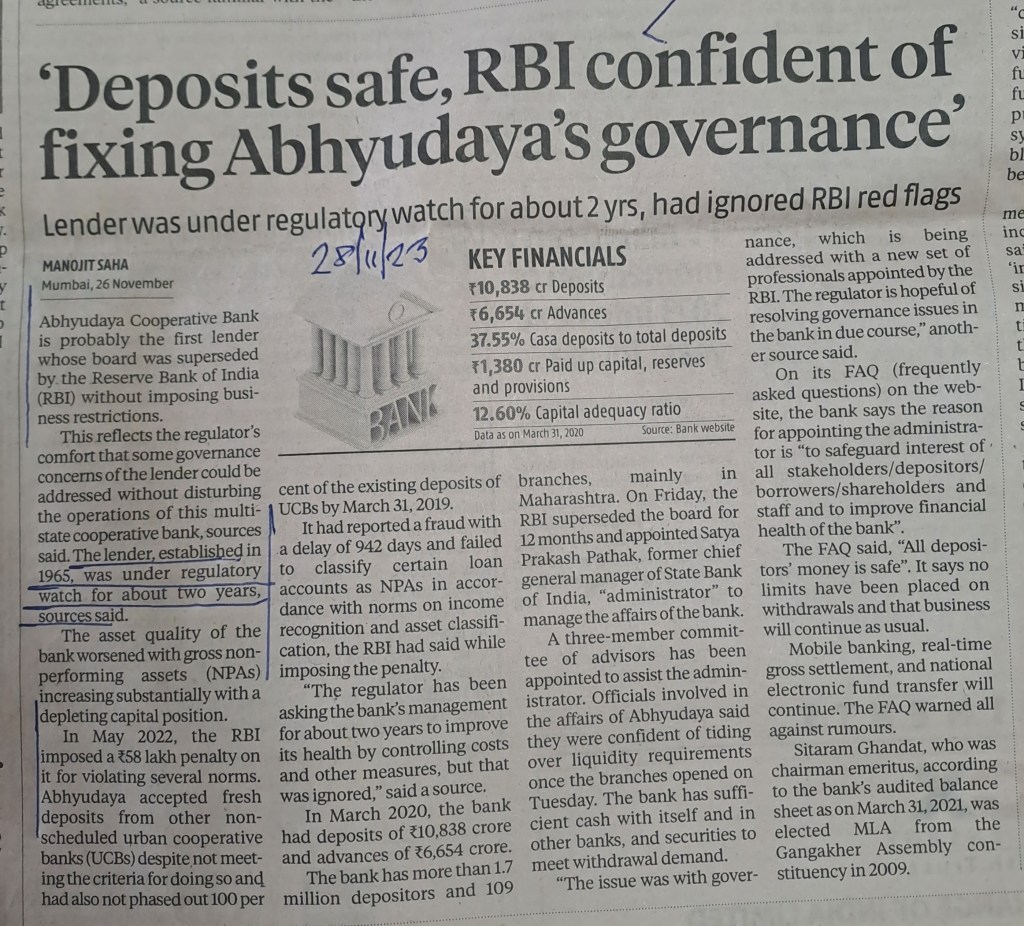 RBI says deposits are safe –Abhyudaya Bank– Courtesy Business Standard–28.11.2023