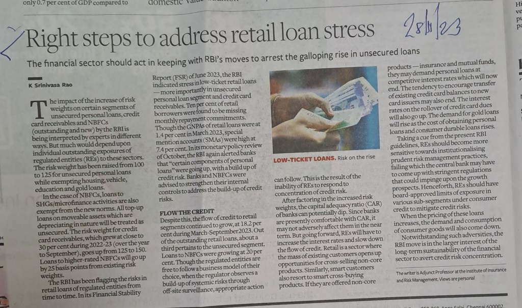 How NBFCs will respond now that Risk weightage –on unsecured loans –is increased – Courtesy BusinessLine 28.11.23