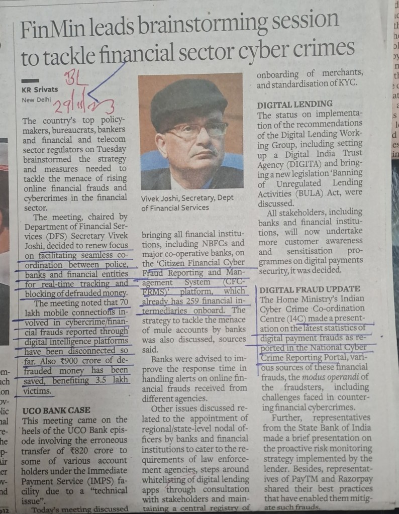 Finance Ministry mulls proactive steps to fight cyber crimes in financial sector –Courtesy BusinessLine 29.11.2023
