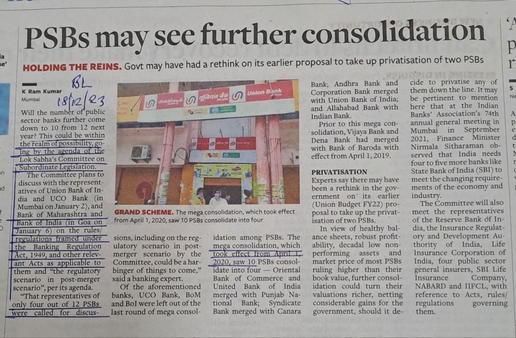 PSBs –Is further consolidation on cards ? Courtesy BusinessLine 18.12.23
