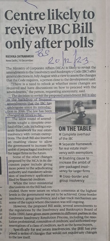 New IBC on anvil–Courtesy Business Standard — 20.12.2023