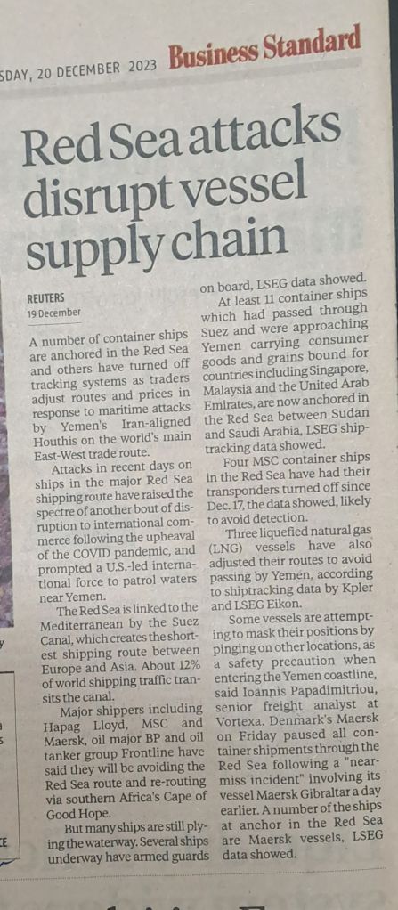 Russia Ukraine war–Red Sea attacks disrupt vessel supply chain–Courtesy Business Standard–20.12.2023