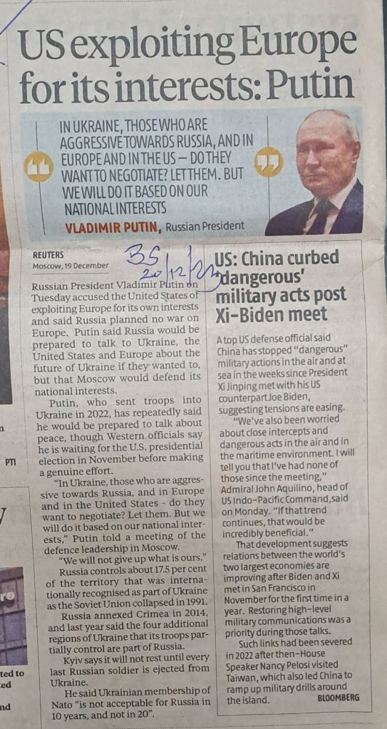 Putin feels US exploiting Europe for its own ends — Courtesy Business Standard 20.12.2023
