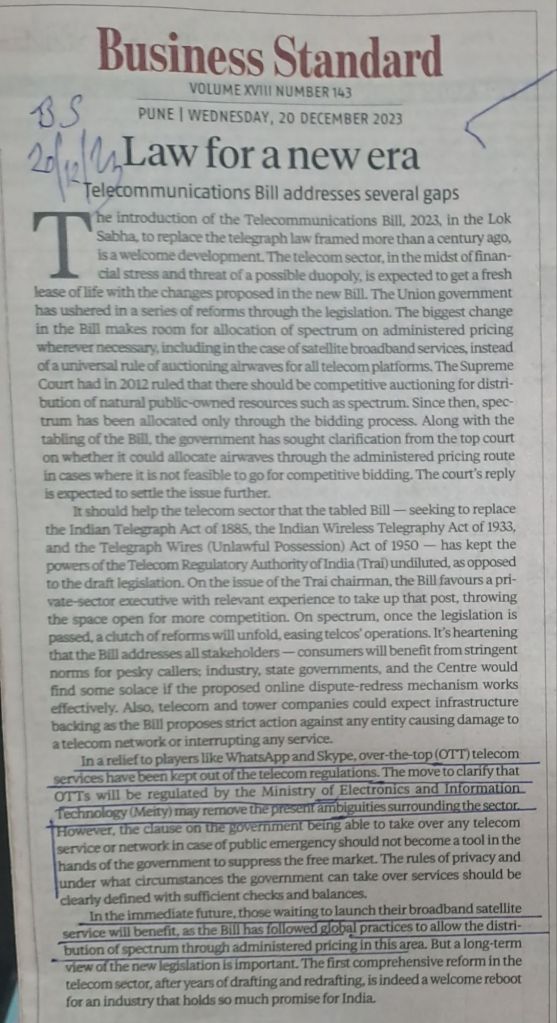 Telecommunications Bill — long awaited changes– Courtesy Business Standard– 20.12.2023