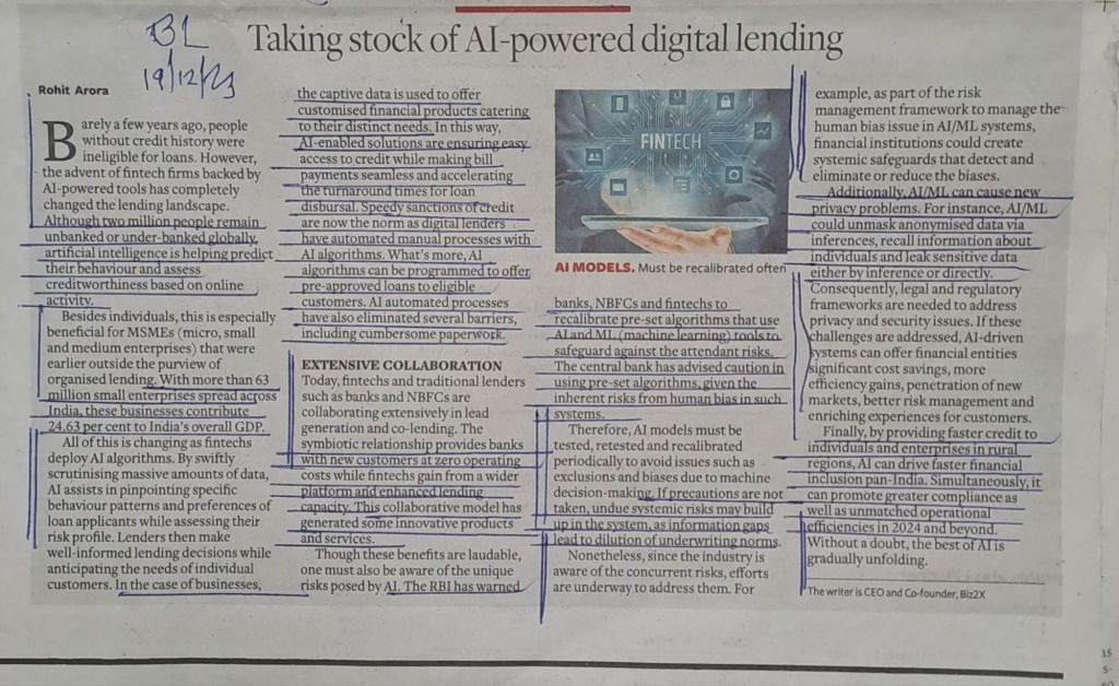 AI-powered digital lending– must read–Courtesy BusinessLine 19.12.2023