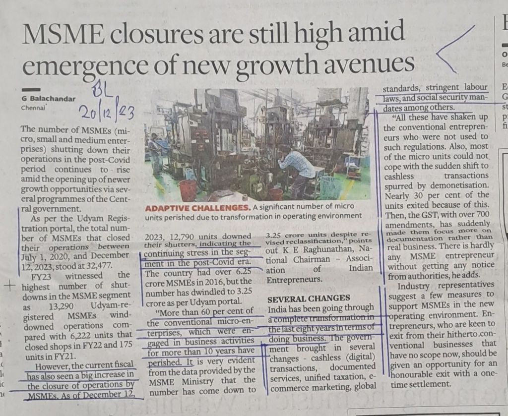 MSME closures –a cause for worry –Courtesy BusinessLine 20.12.2023