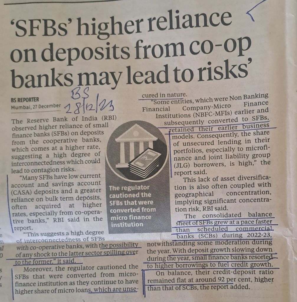 Truth is –Micro Finance banks –did not change their business model even after getting converted into Small Finance Banks [ SFBs ]– the price ?– deposits from cooperative banks at prohibitive cost—Courtesy Business Standard 28.12.2023